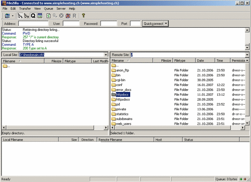 Beachten Sie bitte, dass die Webseiten- Inhalte in den httpdocs Ordner kopiert werden müssen, und subdomains in den entsprechenden Ordner. Web-User Dateien befinden sich im web_users Ordner. Mit Doppel Click oder Drag & Drop können sie die Dateien von Ihrem PC (linke Seite) auf den Server (rechte Seite) kopieren oder natürlich umgekehrt.