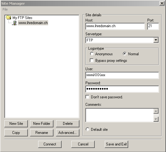 Haben Sie einen Zugang per FTP gewählt, so können Sie Ihre Daten mit einem beliebigen FTP Programm auf unsere Server laden.