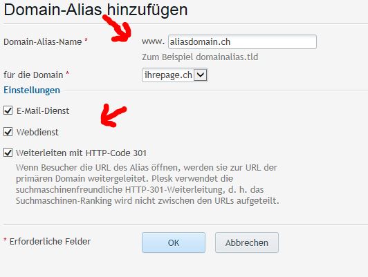 3. Geben Sie nun den Domain Alias Namen an. Geben Sie an, auf welche Hauptdomain dieser zeigen soll